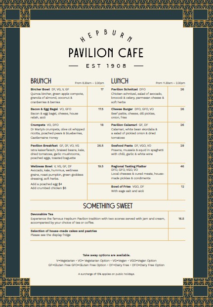 The Hepburn Pavilion Cafe has undergone a gorgeous transformation in November 2025, serving a delicious new menu. The brunch menu is available every day from 8.30am to 2.30pm with a Dr Marty’s crumpets with whipped ricotta, the Pavilion breakfast, a Bircher Bowl, Bacon & Egg Bagel or a fresh Wellness Bowl with avocado, kale, hummus, wellness grains and a green goddess dressing.